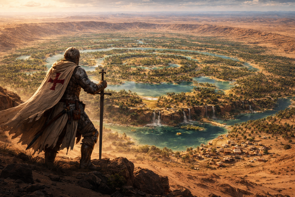The story of the Eye of The Sahara City, now lovingly called EOS City by the the Eosians as the inhabitants are named, started a very very long time ago… A weary knight, a deserter of the Crusades against the Arabs and the Moors, had fled from the war and was nearly dead from starvation and dehydration when he stumbled of a desert hill…what he found was a sunken land, more beautiful than he could ever imagine. Hidden from the surrounding desert, this sunken land was a myriad of oases and fertile lands. He could feel the strength of the Earth’s energy flowing through this land as he drank from the oasis. A small settlement welcomed the wandering knight and he decided to stay and farm the land. Word got out and more people came, Moors, Arabs, knights fleeing from the war, travelers and traders, many felt the strength of the place and decided to work the land together and to stay and call EOS City their home.
